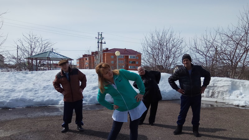 Весенняя солнечная погода позвала получателей социальных услуг на улицу, где медицинская сестра Лилия Зверева провела зарядку на свежем воздухе.