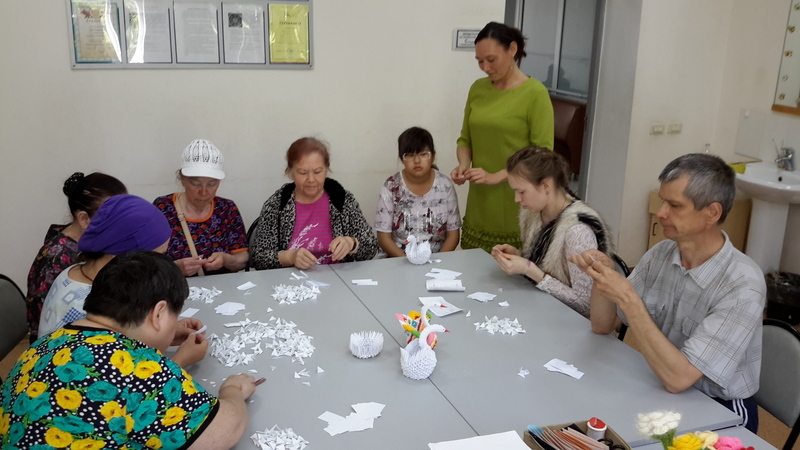 В ходе занятия участники изготовили треугольные модули для создания композиции «Лебедь». Творческий процесс происходил в теплой дружелюбной атмосфере. Всего в мероприятии приняли участие девять человек, которые в результате составили вместе одну целую композицию.