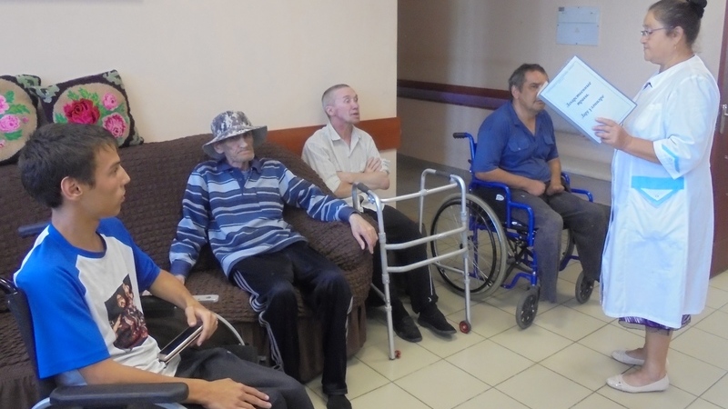 Медсестра Сария Калимуллина рассказала получателям социальных услуг, что не рекомендуется выходить на улицу с 11 до 16 часов, ходить под прямыми солнечными лучами. В жаркую погоду она посоветовала пить больше воды.