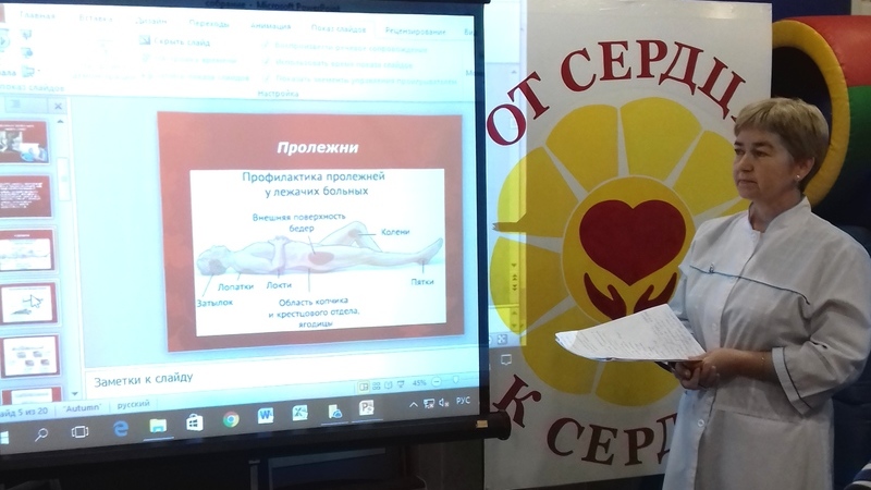 Медицинский работник центра З.Г. Зиннатова провела обучающие занятие для социальных работников, осуществляющих уход за инвалидами, гражданами пожилого возраста на дому по технологии «Школа ухода за пожилыми гражданами и инвалидами». В ходе занятия были затронуты следующие темы: процедура общего ухода, профилактика осложнений, методы самообслуживания и самоконтроля, дезинфекция, гигиенический уход на дому, правила питания и кормления, методы использования технических средств реабилитации и др.