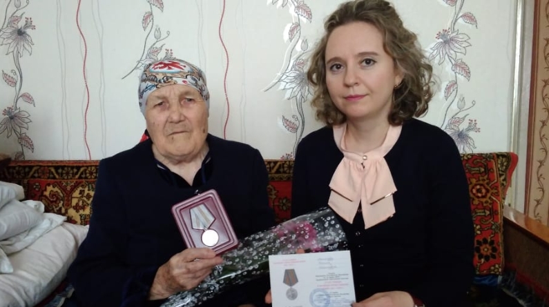 Юбилейные награды 10 труженицам тыла, состоящим в отделении надомного социального обслуживания, вручили специалист по социальной работе Бугульминского комплексного центра «Радуга» Екатерина Колупаева и соцработники.