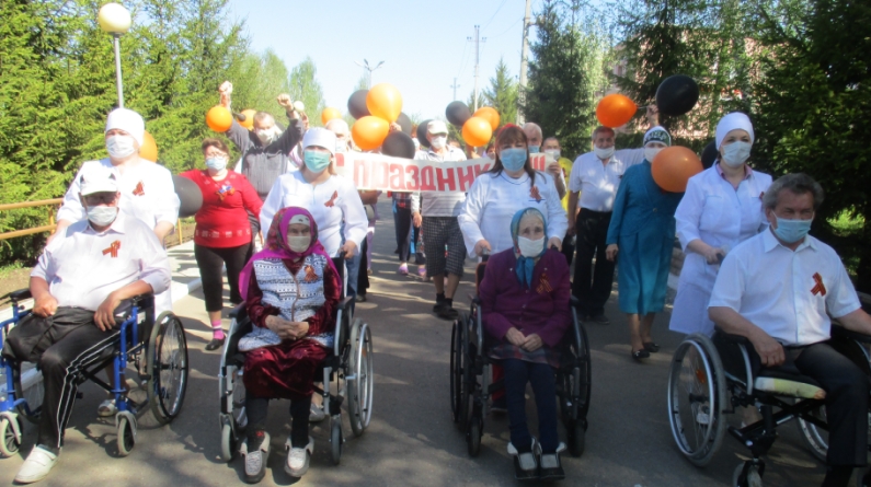 Подопечные дома-интерната и сотрудники прошлись по территории учреждения до обелиска павшим солдатам, возложили цветы. После этого состоялся праздничный концерт агитбригады Мензелинского дворца культуры. Получатели социальных услуг и сотрудники дома-интерната с удовольствием пели песни военных лет и танцевали под любимые мелодии.