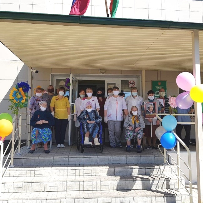 На празднично оформленной территории сотрудники с получателями социальных услуг устроили и маленький парад в честь Дня Победы, исполнили вместе фронтовые песни, посмотрели онлайн-концерты районных домов культур и онлайн-поздравления волонтеров, руководителей исполкомов и родственников получателей социальных услуг.