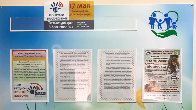 В рамках реализации рабочей программы по развитию правовой грамотности, правосознания и безопасности несовершеннолетних «Защитим себя и мир» специалист по работе с семьей Мензелинского комплексного центра социального обслуживания населения Наталия Кудряшова оформила тематический стенд о детском телефоне доверия.