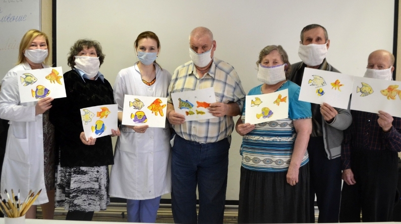 Сначала пожилые люди простым карандашом нарисовали по три разных наброска рыбок, а затем, используя акварельные краски, раскрасили их в разных техниках. Использование в работе поваренной соли стало для участников занятия интересным новшеством.