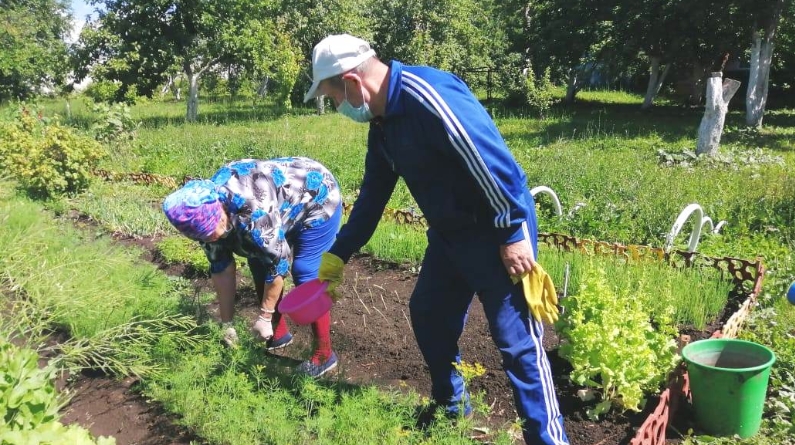 В летние дни трудотерапия проходит на территории дома-интерната: жители вместе с социальными работниками облагораживают клумбы, ухаживают за цветами, выращивают овощи. Сегодня для обеденного стола собрали свежие огурцы и зелень для приготовления летнего салата.