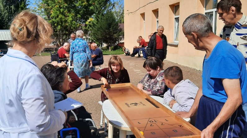 Занятие спортом стало одним из приоритетных направлений реабилитации и абилитации получателей социальных услуг в стационарных учреждениях. На свежем воздухе были организованы площадки с настольными играми шаффлборд и новус, приобретенными на грант конкурса социальных проектов «Общественная инициатива 2019».
