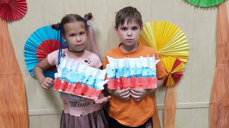 На занятии дети совместно с родителями изготовили флаг России пи помощи ножниц, цветной бумаги, красок и клея. Из объемных заготовок в виде бабочек и голубей получился необычный триколор.