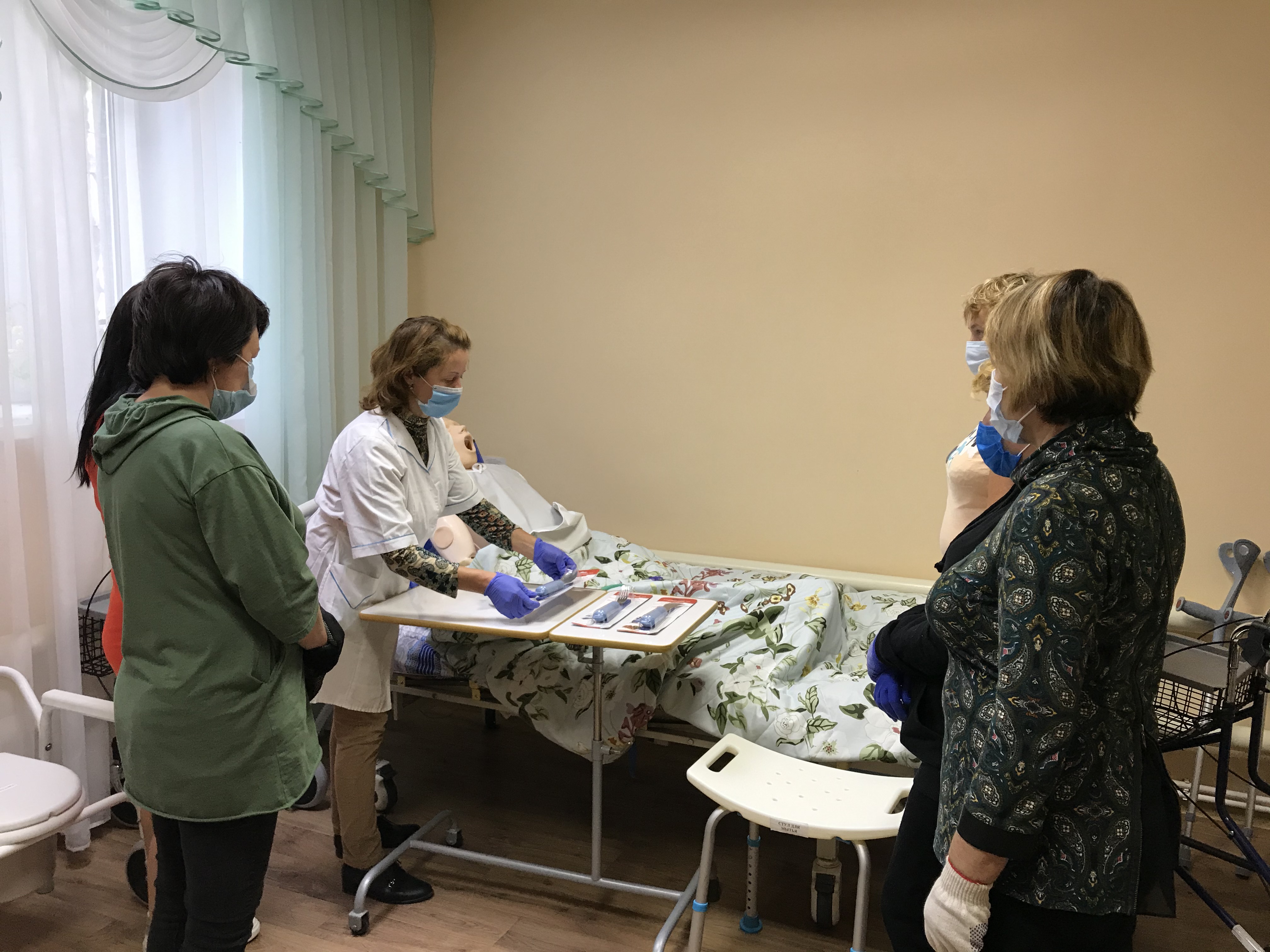 В ходе занятия были освещены основные принципы осуществления ухода за человеком с дефицитом самообслуживания, объяснена процедура кормления с использованием специальных столовых приборов, нагрудника, поильника.