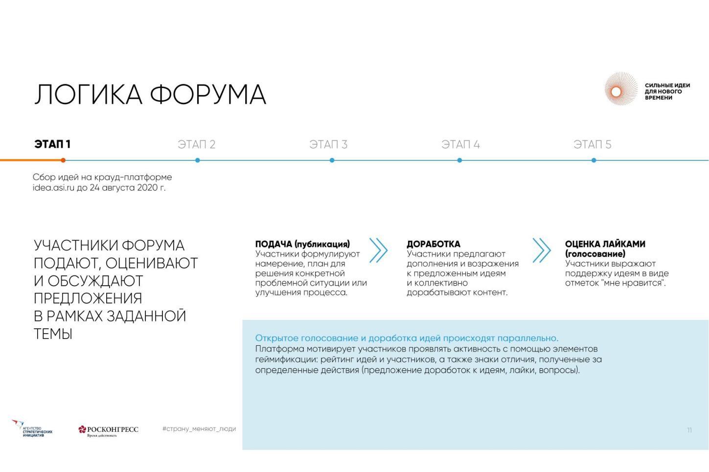 В сентябре 2020 года Агентство стратегических инициатив и Фонд Росконгресс проводят федеральный форум «Сильные идеи для нового времени», который является площадкой для презентации гражданами своих идей и прямого обсуждения с руководством страны проектов по устойчивому развитию РФ в новых экономических условиях.