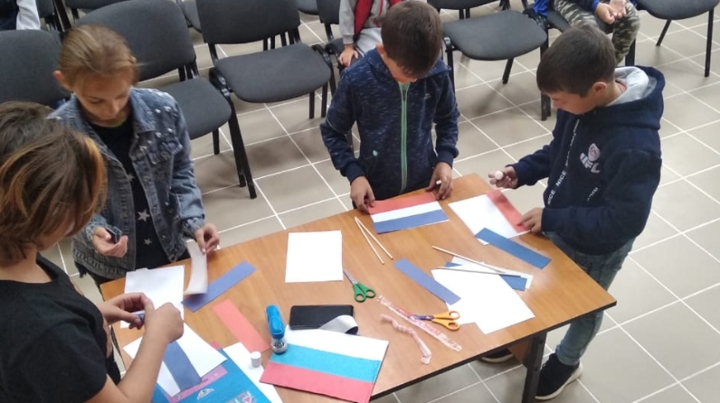 Исторический экскурс плавно перешёл в мастер-класс «Символ гордости и славы», на котором ребята своими руками сделали российский флаг при помощи цветной бумаги, клея, картона и ножниц.