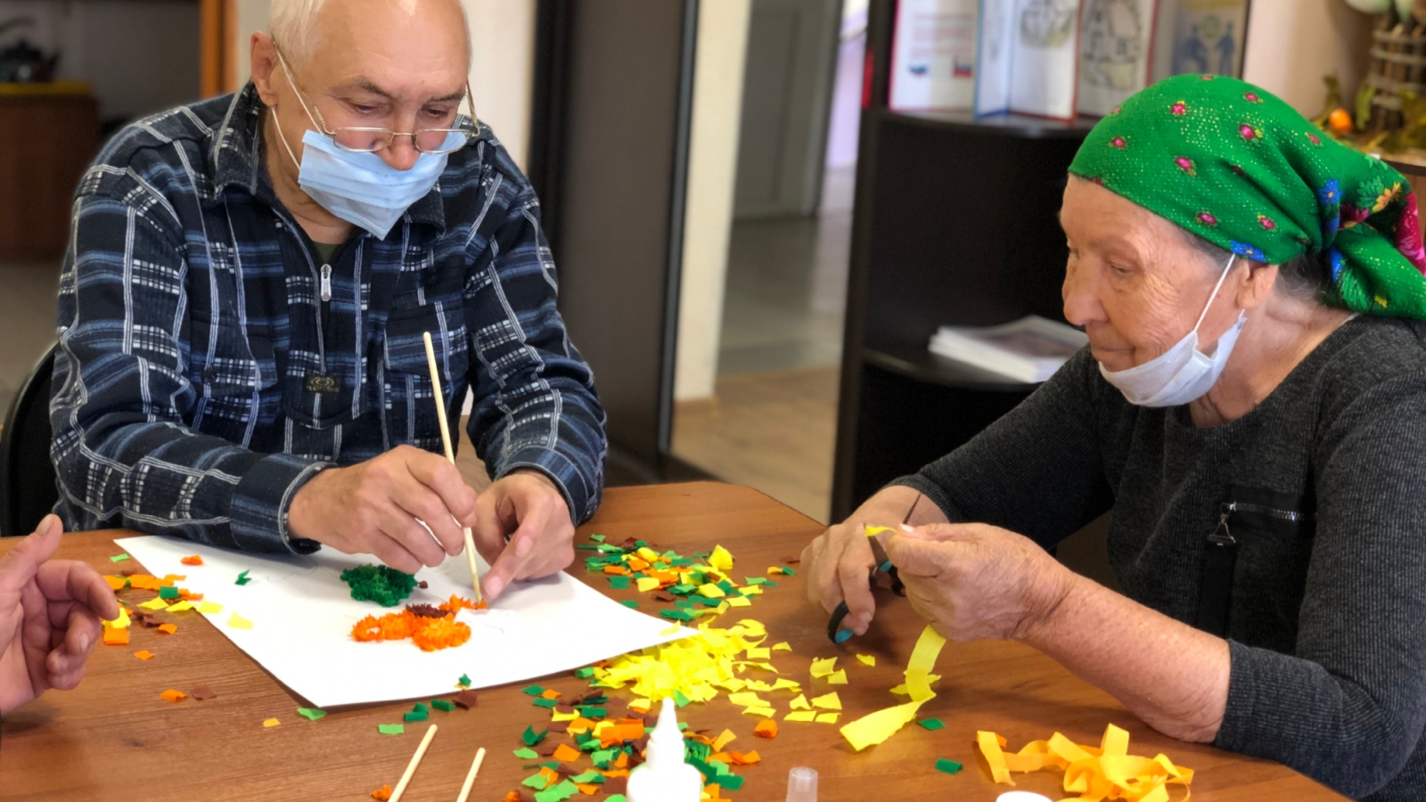 На очередном занятии жители дома-интерната познакомились с техникой торцевания и научились создавать композиции. Из гофрированной бумаги получатели социальных услуг смастерили объемный и необычайно красивый цветок.