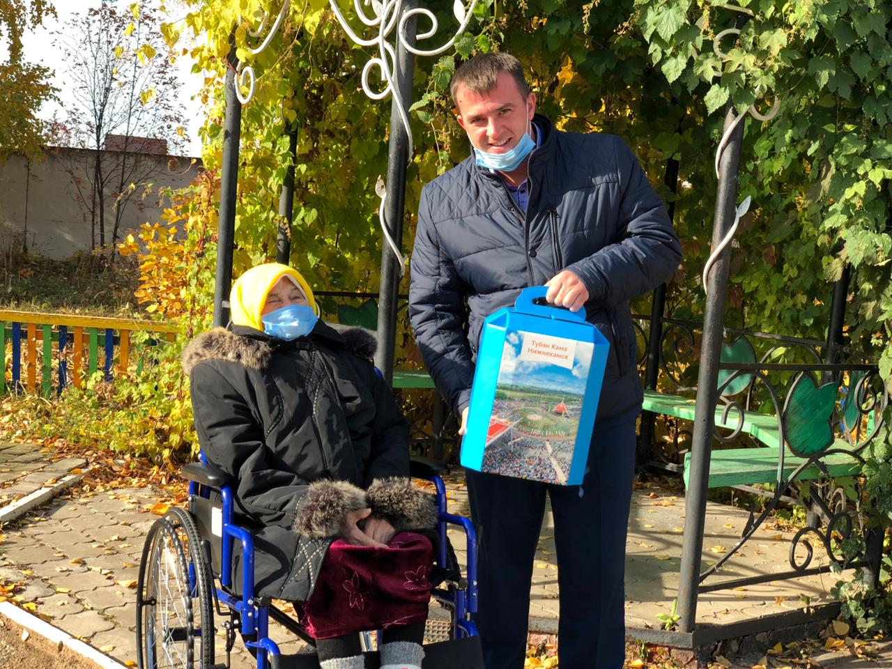 Также навестить проживающую в доме-интернате труженицу тыла Хамиду Шакировну Вафину приехал глава Елантовского сельского поселения Нижнекамского района Владимир Лебедев. Он поздравил Хамиду Шакировну с праздником и, пожелав крепкого здоровья и долгих лет жизни, вручил ей подарочный набор.