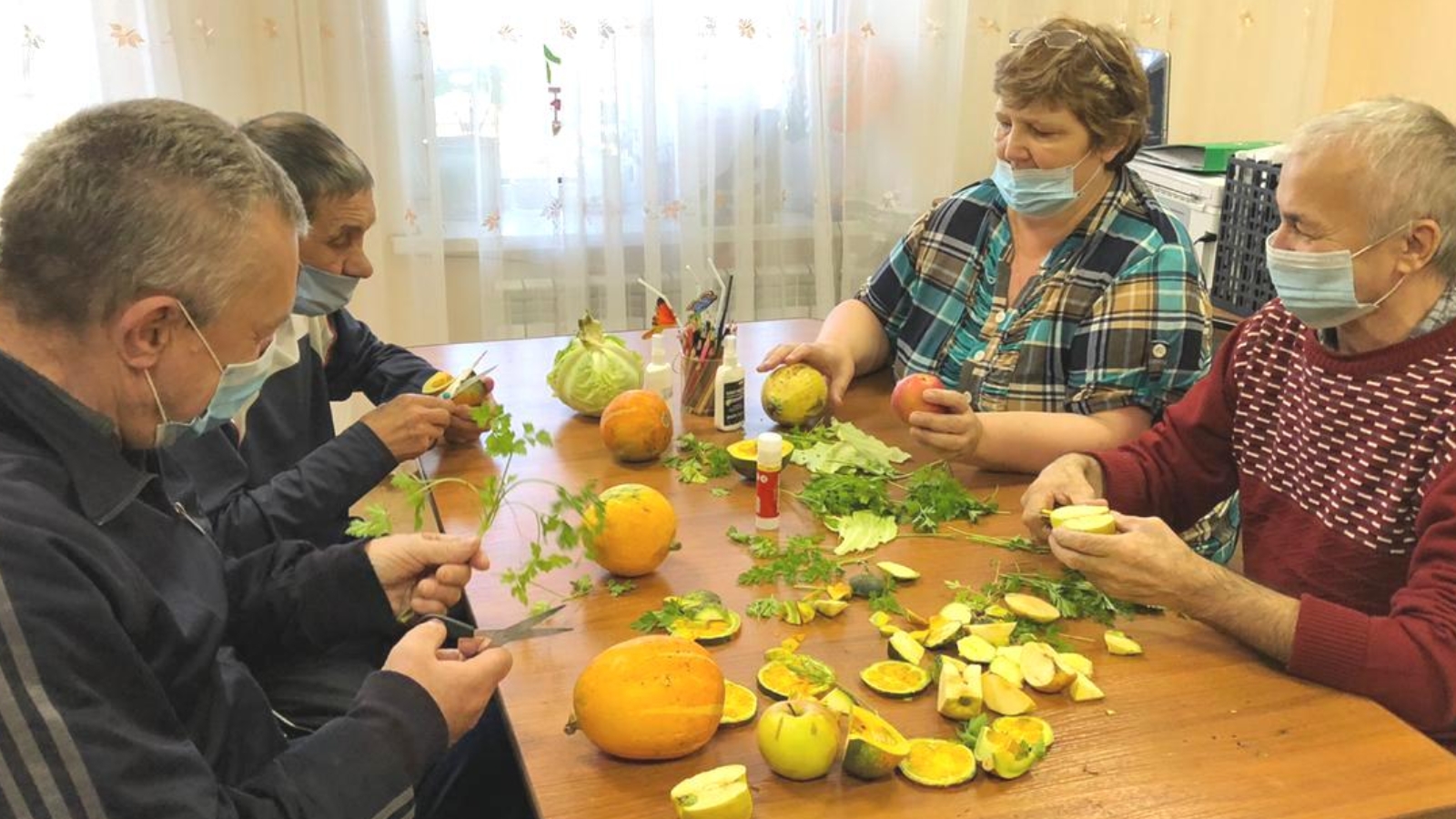 Эта техника дает полную свободу для самовыражения и творчества. После того, как получатели социальных услуг прослушали рассказ об этом виде аппликации, они сделали из фруктов и овощей невероятно красивую композицию. Коллективная работа помогла пожилым людям сплотиться, почувствовать командный дух.