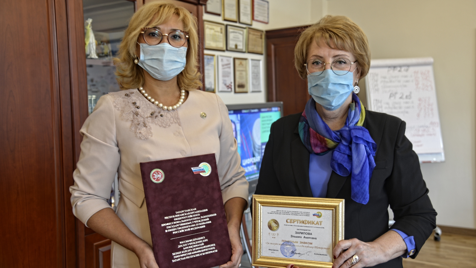 В завершение совещания Калашникова О.А. по поручениям Президиума Татарстанской республиканской организации Общероссийского профессионального союза работников государственных учреждений и общественного обслуживания Российской Федерации и председателя Общероссиийского профессионального союза работников государственных учреждений и общественного обслуживания РФ Н.А. Водянова наградила Э.А. Зарипову почёным знаком «За заслуги перед Профсоюзом в Республике Татарстан» и юбилейным знаком «100 лет Профсоюзу работников государственных учреждений России».