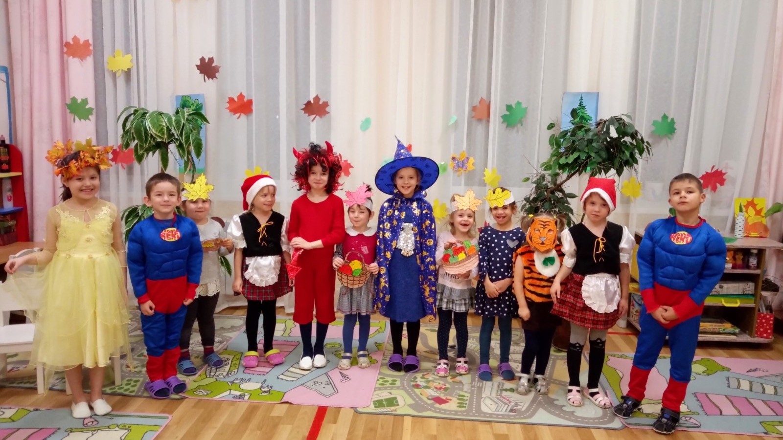 В гости к ребятам пришла лесная волшебница со своей помощницей Осенью. Они пригласили ребят к себе в гости в сказочный лес и рассказали про время года, когда природа пестрит яркими цветными красками. Подопечные отгадывали загадки про птиц и зверей, танцевали, соревновались в быстроте и ловкости.