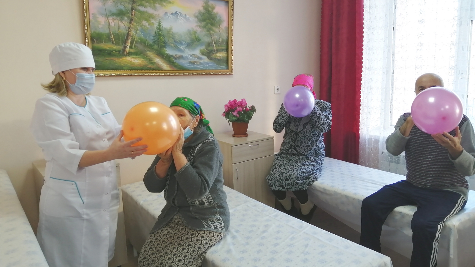 Проживающим предложили увлекательную и в то же время полезную методику надувания воздушных шаров. Как рассказала медицинская сестра, этот способ с давних времен рекомендуется в качестве оздоровительной и восстановительной методики. При надувании человек делает глубокий вдох и долгий выдох, повышая газообмен в легких. Это, в свою очередь, улучшает вентиляцию легких. Кроме того, такие упражнения благотворно влияют на общее самочувствие человека и повышают настроение.