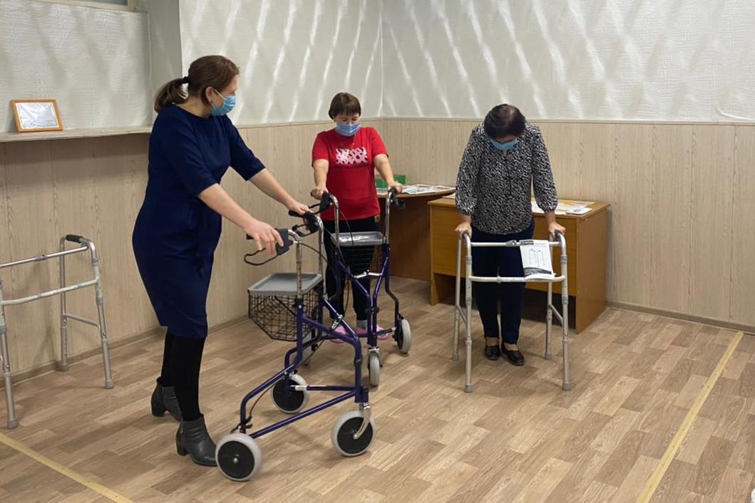 На этой неделе в соответствии с планом проведено занятие по теме «Двигательная активность лиц пожилого возраста, оказание помощи при перемещении в пространстве. Профилактика падений». Со слушателями изучили теоретические основы, правильное использование трости, костылей, ходунков. Также еще раз упоминалась важность исключения острых углов, высоких дверных проемов, освобождения комнаты от лишней мебели, укрепления ковров на полу.
