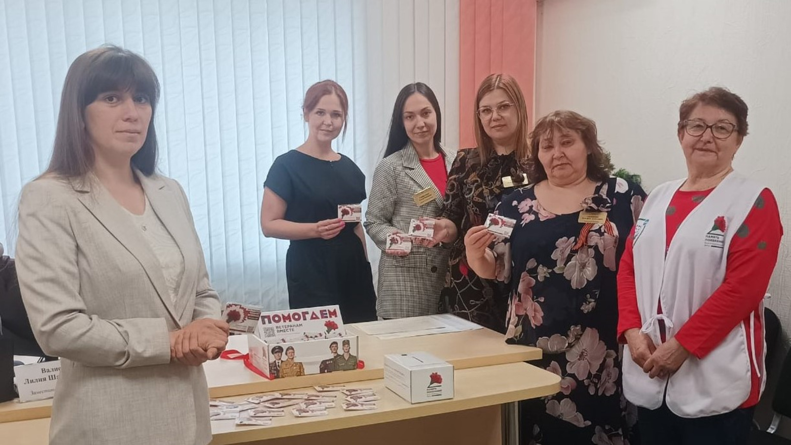Специалисты социальной отрасли приобрели у волонтеров стилизованные значки в форме красной гвоздики. Средства, вырученные от значков, направляются на медицинскую помощь ветеранам.