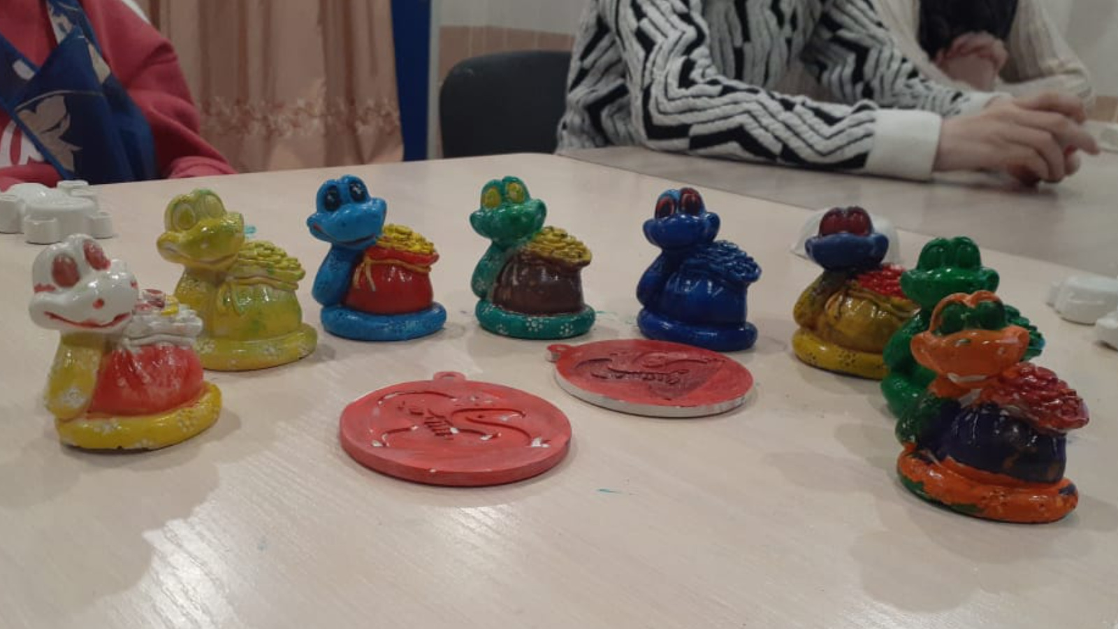 Перед началом занятия с участниками изучили состав и свойства гипса. Далее сделали гипсовые фигурки в форме змеи и раскрасили их.