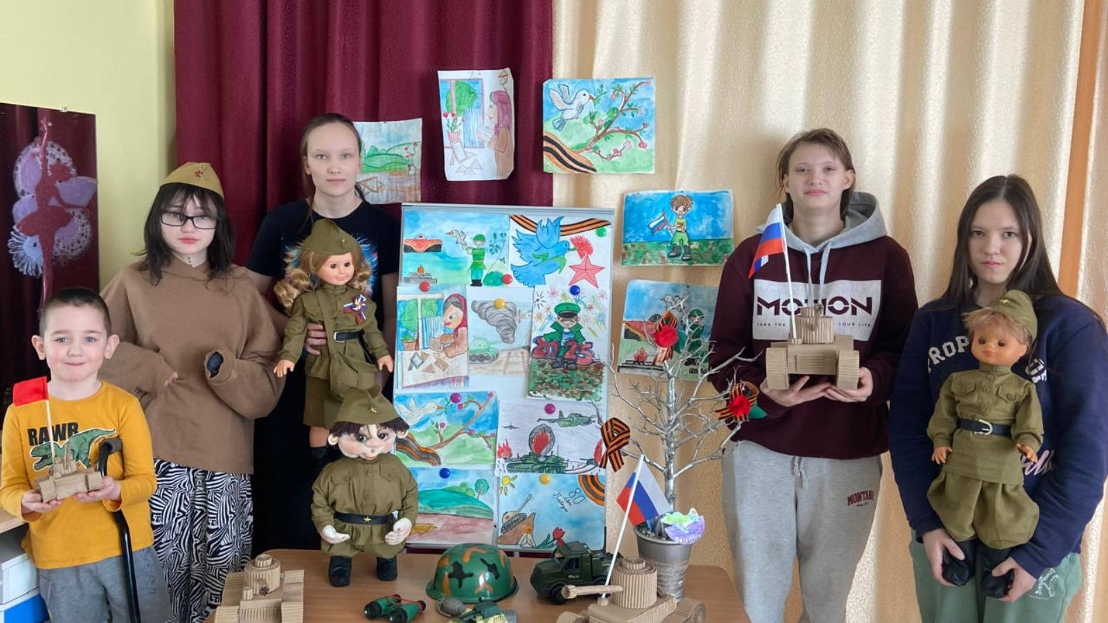 Дети самостоятельно подготовили рисунки, выполнили макеты моделей военной техники, сшили образцы военной формы рядового и санитара, а также представили другие поделки на военную тематику.