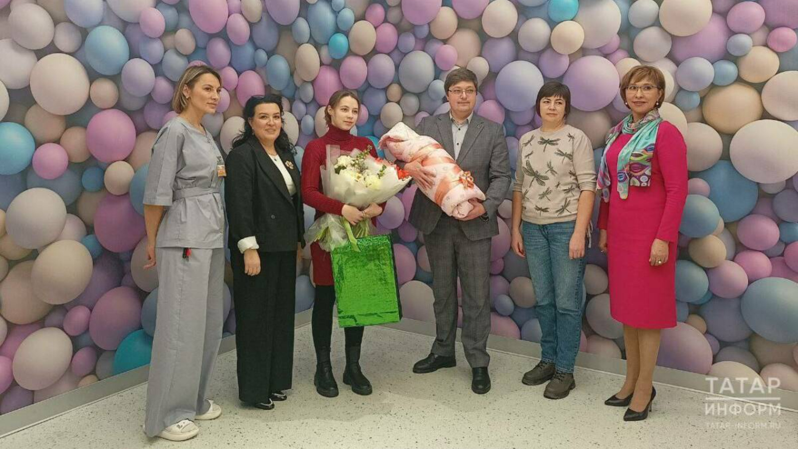 Молодую маму с дочерью встретили ее родители. Министр труда, занятости и социальной защиты РТ Эльмира Зарипова вручила Анне подарочный комплект детских принадлежностей.