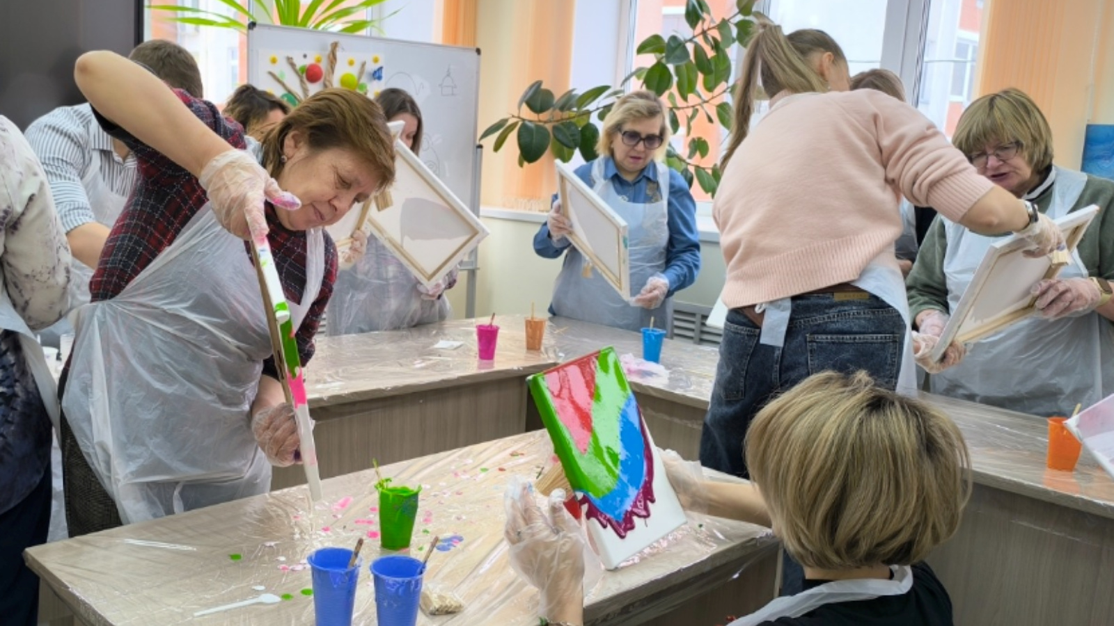 В начале мастер-класса участников ознакомили с приемами необычной техники рисования без традиционных кистей и мазков – путем заливки акриловых красок. Затем приступили к увлекательному процессу создания ярких полотен.