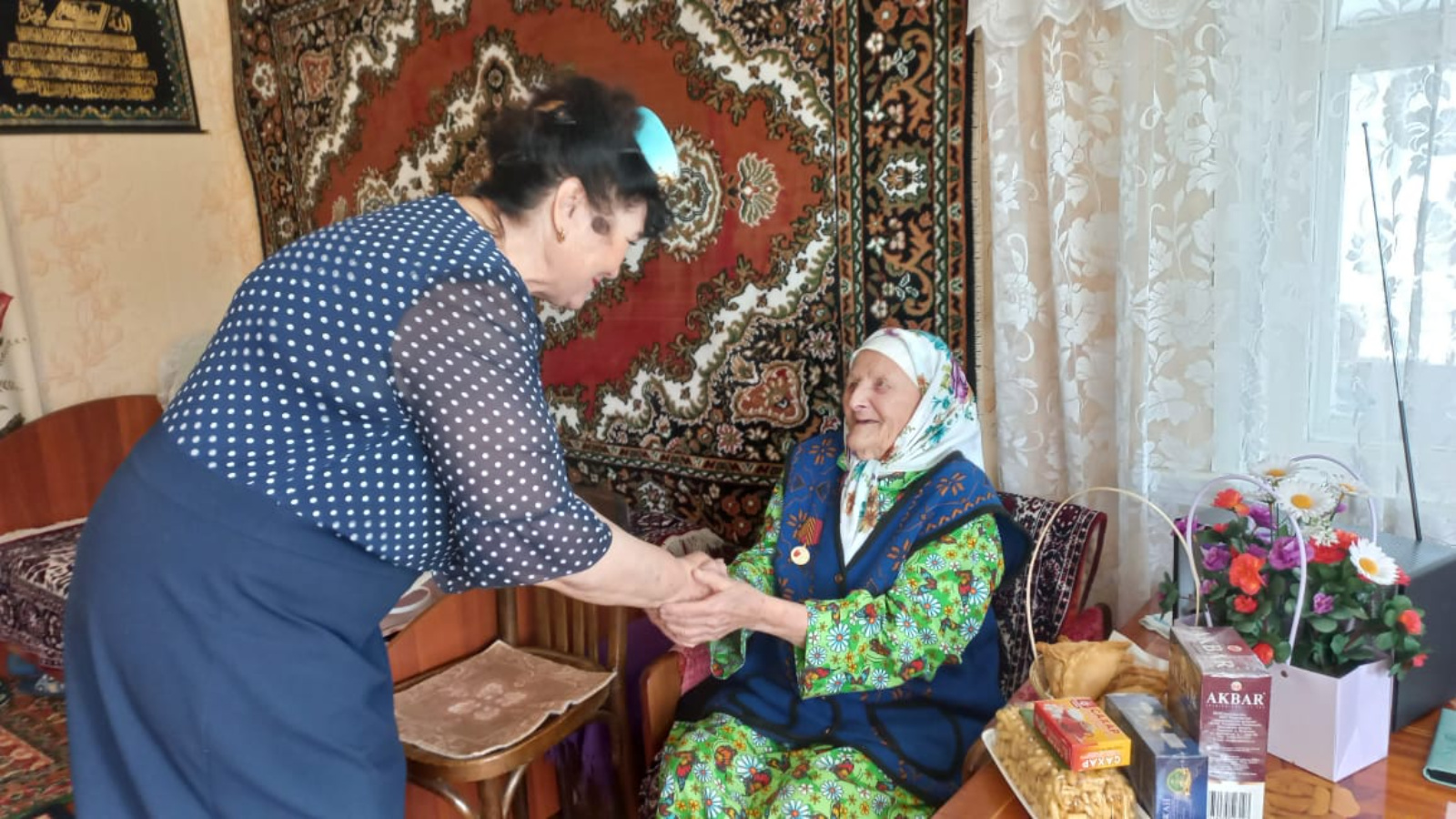 На днях председатель Совета ветеранов Файруза Вазеева и заведующий отделением надомного обслуживания Гульнур Исмагилова посетили труженика тыла Хайрлевару Ямалееву. Ветерана войны угостили татарскими национальными угощениями.
