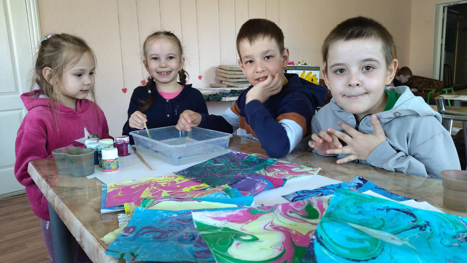 Участники занятия, используя специальные кисти и инструменты, наносили краски на воду. Дети с увлечением наблюдали, как капельки красок распространяются по поверхности воды, создавая фантастические узоры, экспериментировали с красками. Затем узоры с воды перенесли на бумагу. Каждый рисунок получился неповторимым.