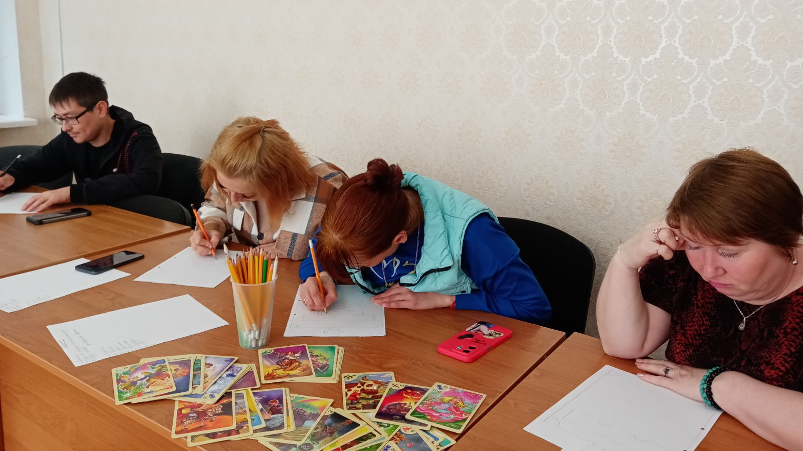 Занятие началось с игры-активатора «Человечки на дереве», благодаря которой каждый участник смог определить свое эмоциональное состояние перед началом общения. Затем были предложены практические упражнения и работа с метафорическими картами «Мастер сказок». Эти задания способствовали развитию умения внимательно слушать собеседника, правильно реагировать на просьбы и оказывать друг другу поддержку.