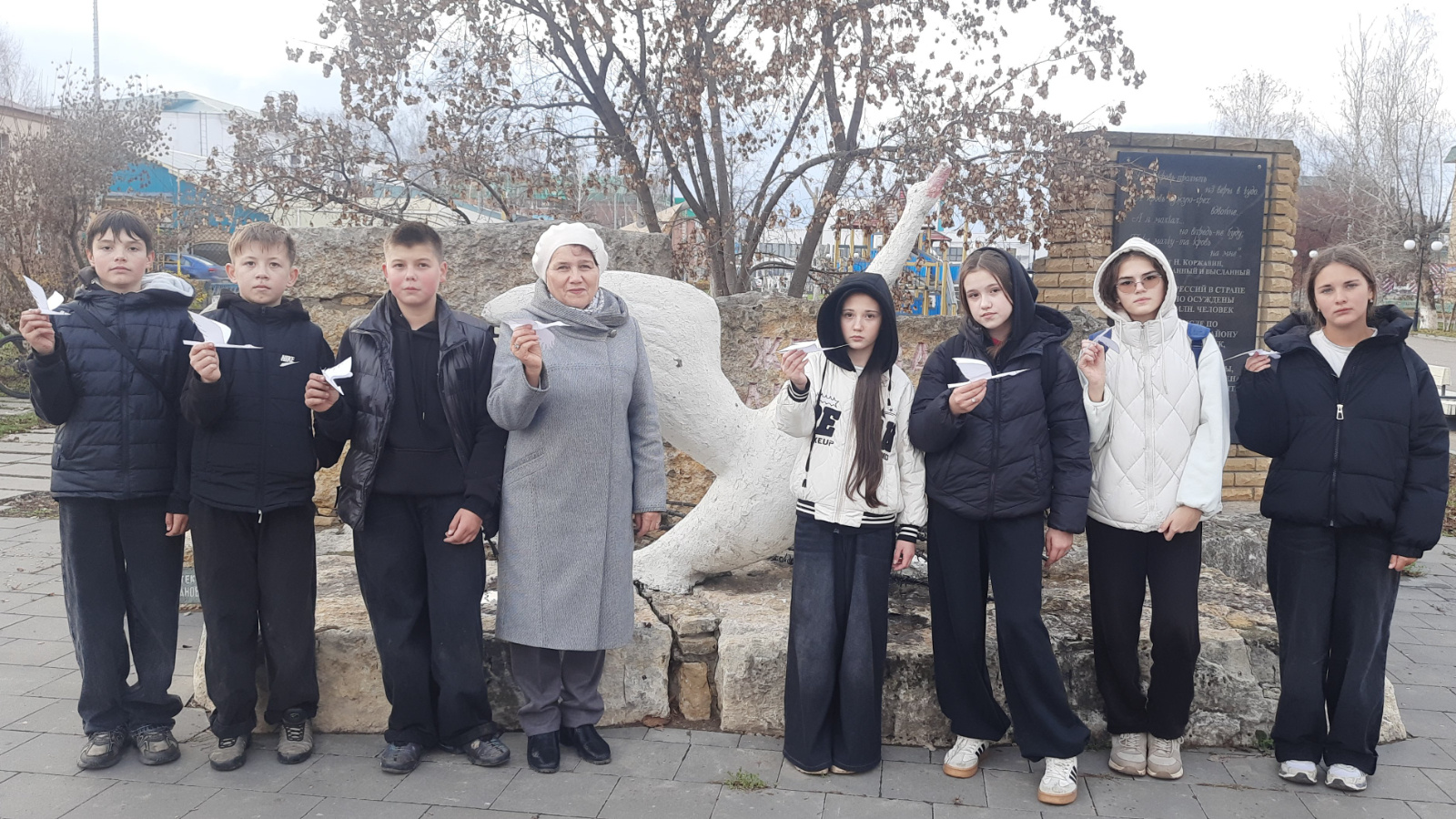 Дети узнали о трагических страницах в истории страны, когда тысячи людей были необоснованно подвергнуты репрессиям, отправлены в исправительно-трудовые лагеря и спецпоселения. Память политзаключенных почтили минутой молчания у обелиска.