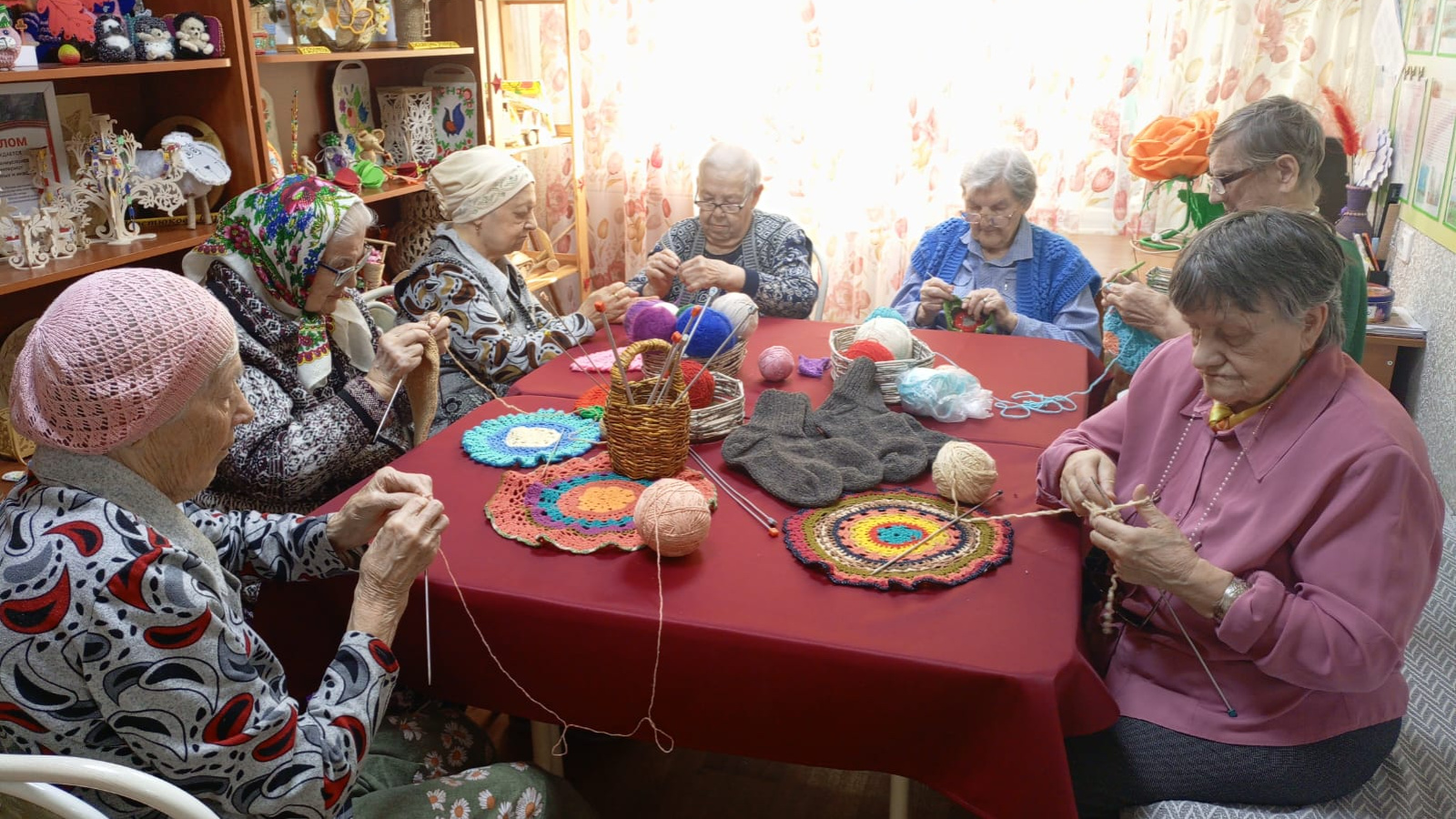 Федая Долгих много времени проводит за вязанием крючком разноцветных ковриков для создания семейного уюта в их с супругом комнате. Валентина Павлова одинаково хорошо управляется и крючком, и спицами, вместе с другими проживающими она связала немало пар теплых носок для солдат, находящихся сейчас в зоне СВО.