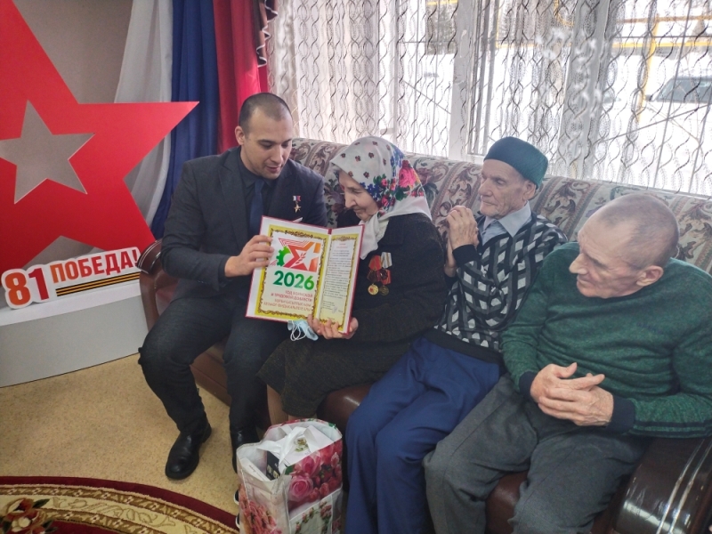Также Герой России Расим Баксиков вручил труженику тыла Елене Нагуськиной поздравительный адрес и памятный подарок.