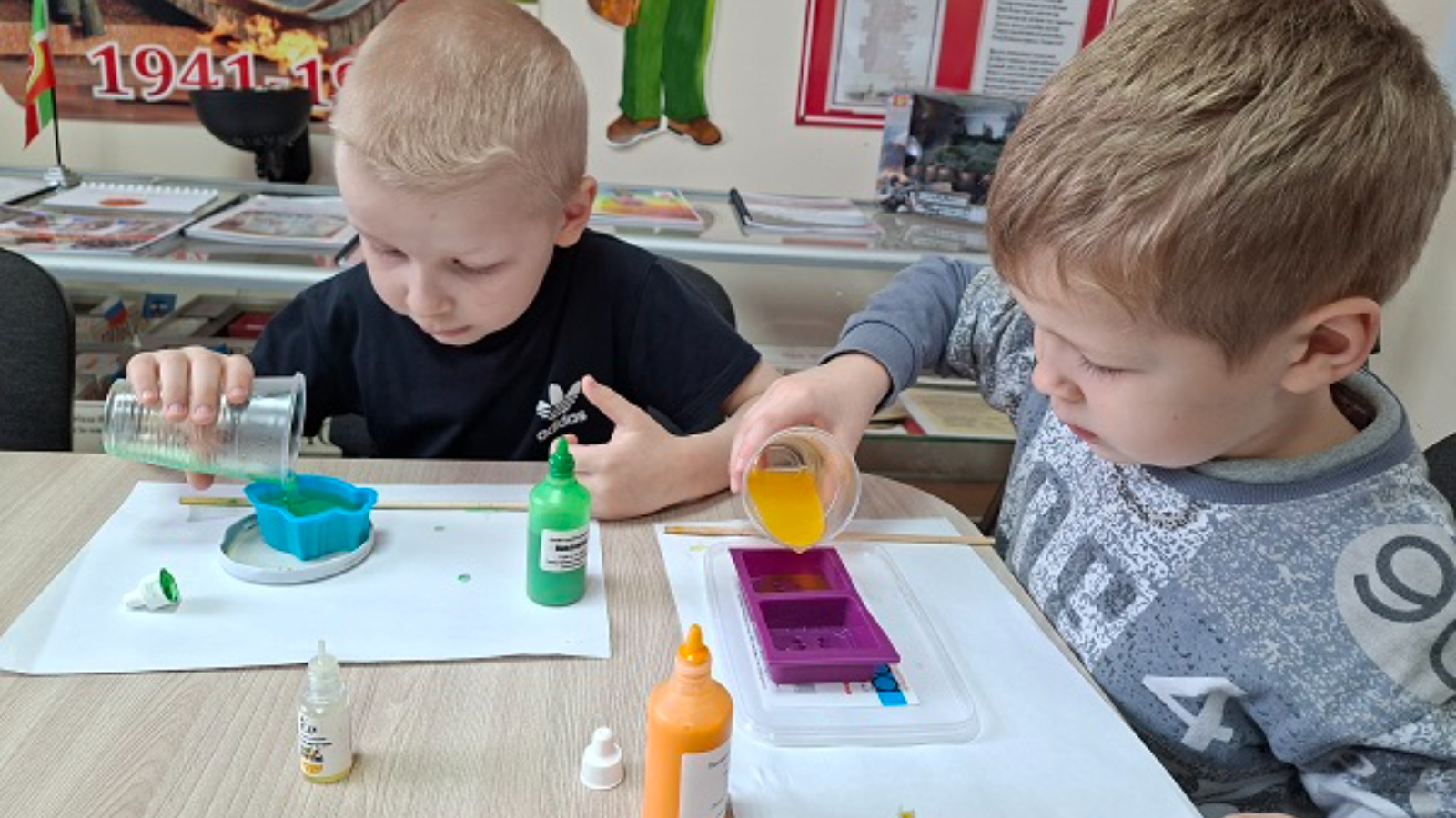 Ребята с удовольствием экспериментировали со сложными цветовыми сочетаниями. В конце мероприятия каждый ребенок упаковал свое творение в подарочную коробку.