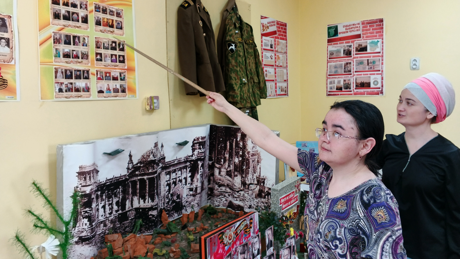 Занятие прошло в музее Верхнекибякозинской средней школы. Педагог представил различные материалы, которые иллюстрировали подвиги местных героев. В процессе обсуждения получатель социальных услуг не только внимательно слушала, но и активно участвовала в разговоре, рассказала о подвигах своей бабушки. Она показала фотографии своей бабушки, что позволило всем участникам занятия лучше понять личную связь с историей и гордость за семейные достижения.
