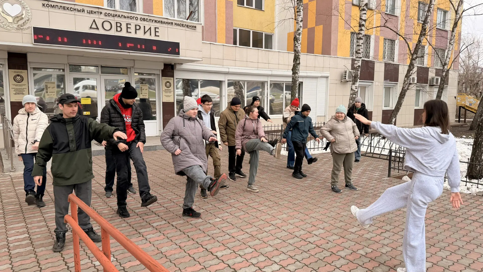 Не остались в стороне и получатели социальных услуг отделения дневного пребывания – люди с ментальными нарушениями, а также сотрудники центра. Совместная утренняя зарядка прошла на свежем воздухе. Под бодрую музыку и получатели социальных услуг, и их наставники с удовольствием выполняли упражнения.