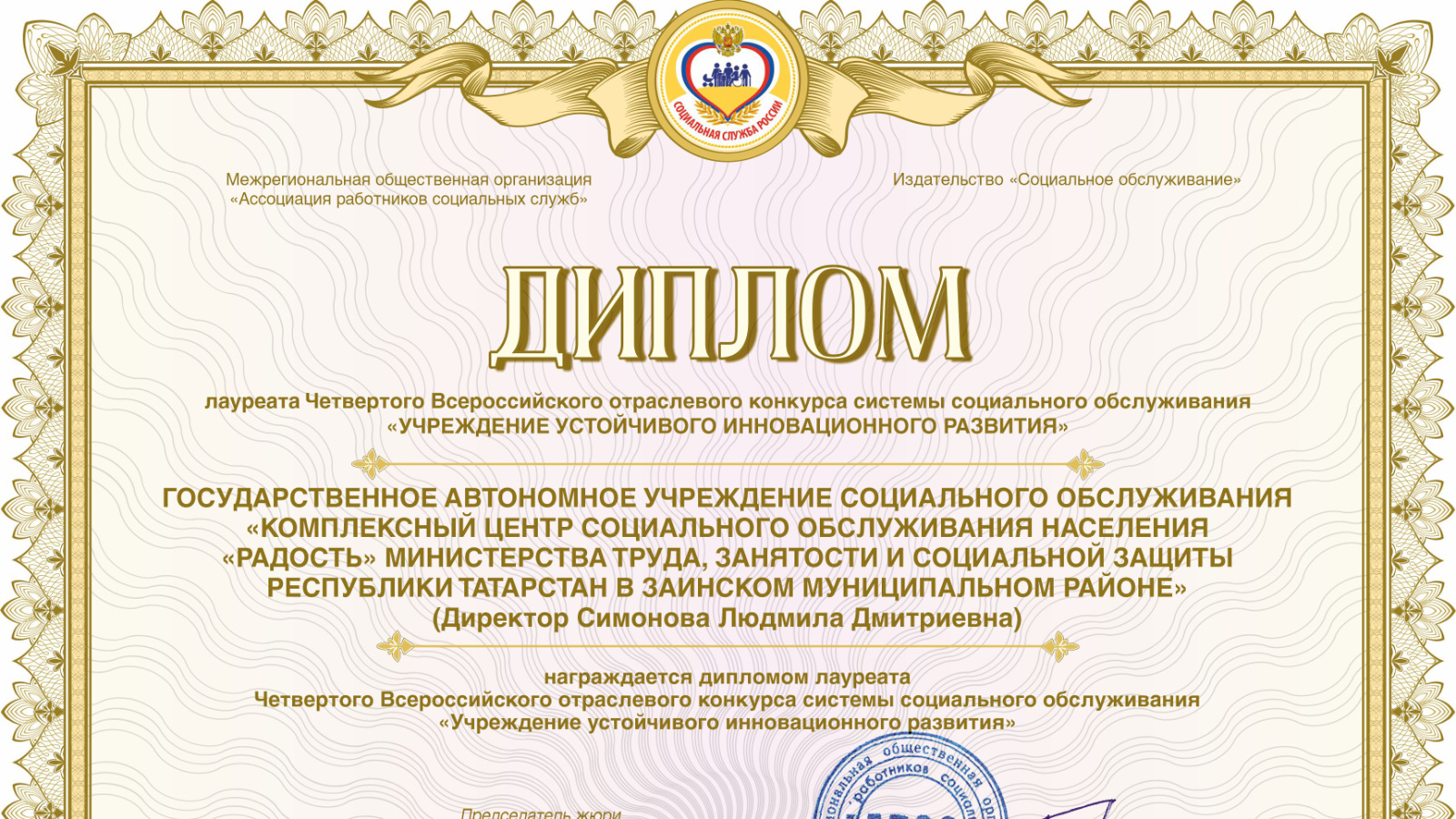 Коллектив Комплексного центра социального обслуживания населения «Радость» Заинского района удостоен почетного звания лауреата IV Всероссийского отраслевого конкурса «Учреждение устойчивого инновационного развития». Конкурс проводится под эгидой МОО «Ассоциация работников социальных служб».
