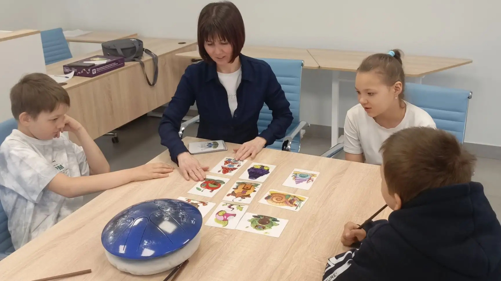 Под чарующие звуки фимбо юные участники вместе с психологом Гузель Мингазовой отправились в увлекательное путешествие. Музыкотерапия помогла активизировать позитивные эмоции, сплотила ребят на невербальном уровне и позволила почувствовать себя настоящей командой. Далее участники знакомились с увлечениями друг друга, учились искусству самопрезентации и тренировали умение слушать и поддерживать сверстников. Игра с яркими фантастическими карточками «Домики» подарила ребятам улыбки и теплые слова, а также помогла преодолеть внутренние трудности и научиться управлять тревожными переживаниями.