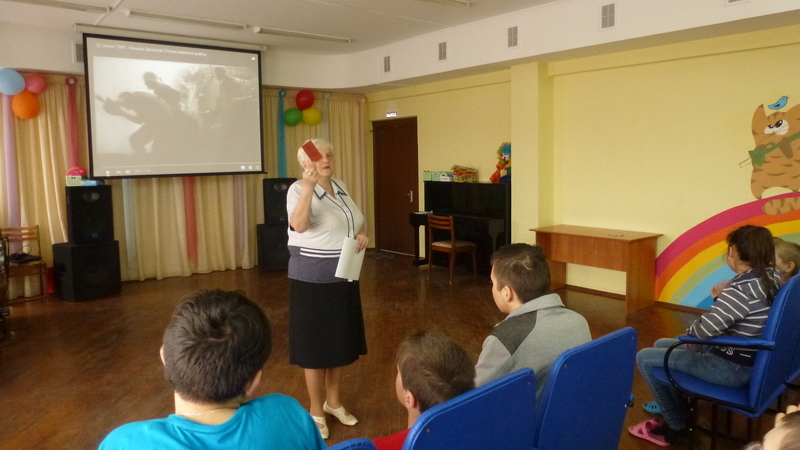 Тәрбияче Трофимова А.М. 18 инвалид бала өчен Бөек Ватан сугышында катнашкан комсомоллар турында сөйләде. Балалар комсомолларның туган җирне саклауда күрсәткән батырлыклары турында фильм карады. Аларны искә алып шигырьләр сөйләделәр.