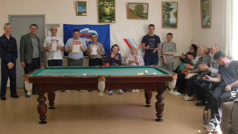 “Изгелек” инвалидларны тернәкләндерү үзәгендә социаль эш буенча белгеч Рәмзия Хайбулова Татарстан республикасының «Спорт хәрәкәте» иҗтимагый оешмасы вәкиле Алексей Мулеев белән берлектә Җиңү көненә багышланган бильярд буенча турнир үткәрде.