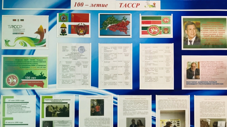 Стендта ТАССР барлыкка килү тарихы һәм республика турында кызыклы фактлар, шулай ук әлеге юбилейны бәйрәм итүгә багышланган чаралар турында мәгълүмат урнаштырылган.