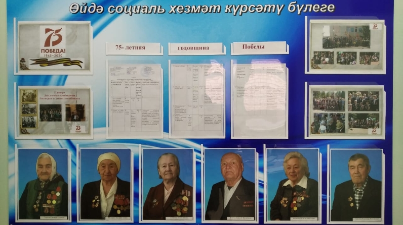Стендта өйдә социаль хезмәтләр алучы Бөек Ватан сугышы ветераннары һәм инвалидларының фотосурәтләре, шулай ук Җиңүнең 75 еллыгын бәйрәм итүгә багышланган чаралар турында мәгълүмат тупланган.