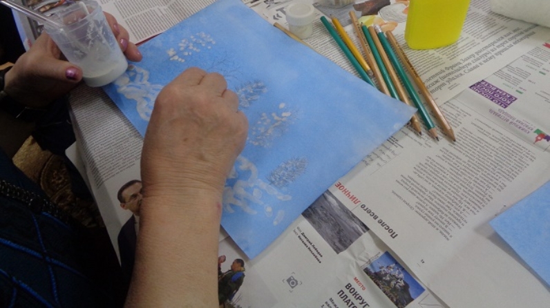 Изотерапия һәм музыкотерапия технологияләре кысаларында Спас өлкәннәр һәм инвалидлар өчен интернат-йортында психолог Людмила Родикова «Кышкы кәеф» дигән дәрес үткәрде.