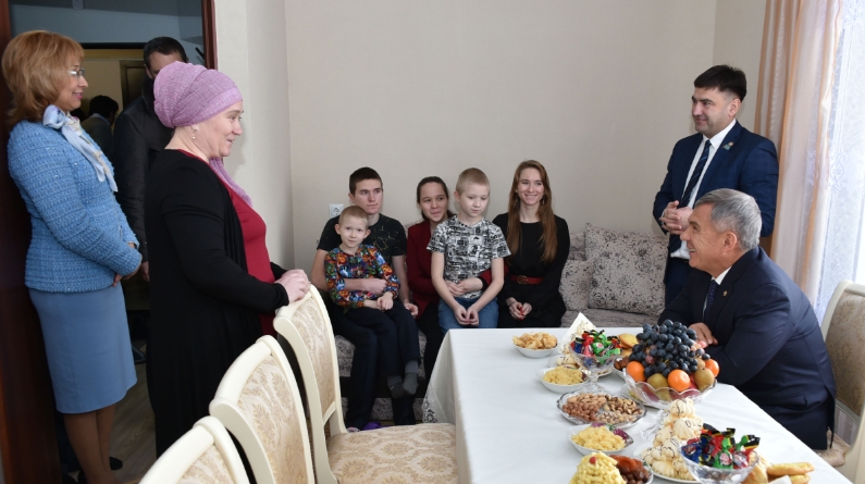Рөстәм Миңнеханов яңа йортка күчүчеләргә – алты бала тәрбияләүче күп балалы Шафиковлар гаиләсенә кунакка керде. Яңа йортка күчүчеләрне шулай ук Татарстан Республикасы Хезмәт, халыкны эш белән тәэмин итү һәм социаль яклау министры Эльмира Зарипова котлады.