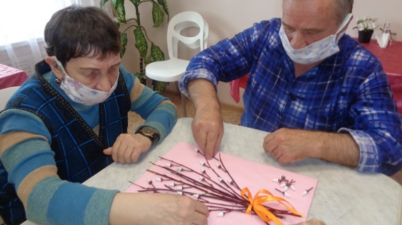 Эш башланыр алдыннан тәрбияче кайнар клей һәм степлер белән эшләгәндә куркынычсызлык техникасы буенча инструктаж үткәрде. Аннары, «Вербное воскресение» музыкаль композициясе астында, социаль хезмәт алучылар «Кызыл тал чәчәк ата» дигән бәйрәм панносы ясадылар.