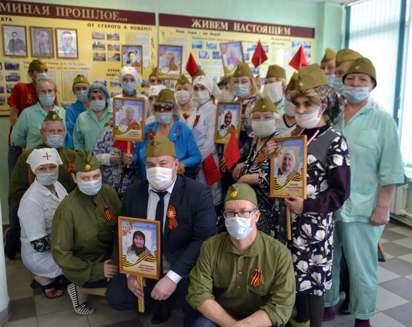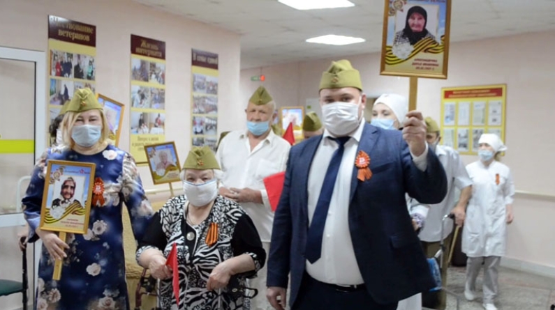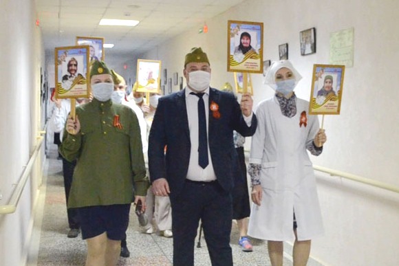 Шуннан соң бергәләп «Үлемсез полк» акциясенә чыктылар. Ул учреждение эчендә үтте. Коридорлар буйлап элек интернат-йортта яшәүче Бөек Ватан сугышы ветераннары фотосурәтләрен алып бардылар.