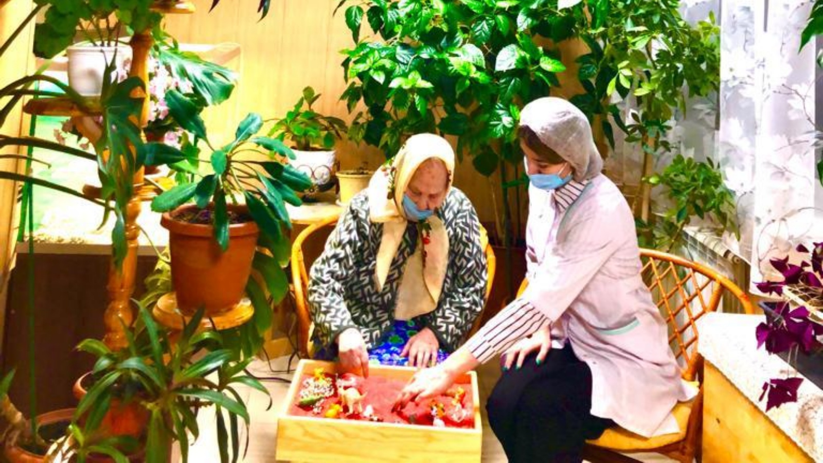 Социаль хезмәт алучылар тулысынча ял итә алсын өчен дәресне учреждениенең кышкы бакчасында үткәрделәр. Биредә, яшеллек һәм чәчәкләр тирәсендә, тыныч музыка астында яшәүчеләр комда рәсем ясыйлар, алар белән төрле хайваннар фигураларын кулланып рольле уеннар уздыралар. Кагыйдә буларак, бу дәресләр индивидуаль формада уза – шулай итеп, социаль хезмәт алучылар үзләрен уңайлы хис итә.