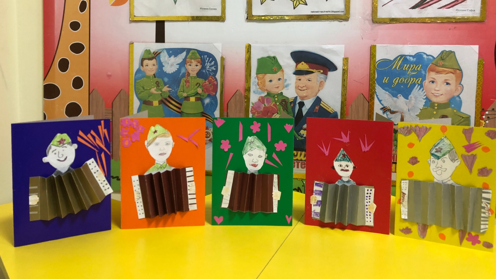 Әңгәмә барышында приютта тәрбияләнүчеләр сугыш елларында фронт җырлары һәм гармуннар нинди зур әһәмияткә ия булуын белделәр. Алар солдатларның хәрби рухын күтәргәннәр, ышанырга һәм җиңәргә булышканнар. Бәйрәмнең асылына кереп, кызлар үз идеяләрен иҗади эштә тормышка ашырдылар – күләмле гармунлы тематик открытка әзерләделәр.