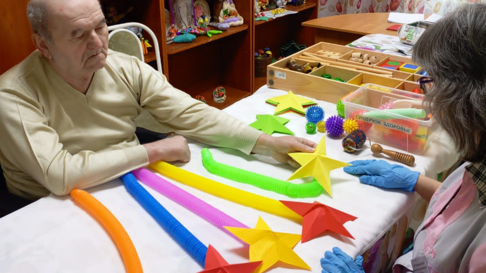 Шул ук вакытта дәресләрдә социаль хезмәтләр алучыларны кызыксындырырга ярдәм итүче, аларның активлыгын стимуллаштыручы элементлар кулланыла. Мәсәлән, 68 яшьлек Рамил Булатов белән дәрес вакытында Татьяна Стригачева энәле туплар, массаж роликлары, су-джок шарлары куллана. Рамил Булатов инсульт кичергән, аннан соң аның уң ягы параличланган, сөйләме бозылган. Тернәкләндерү дәресләре аның тирә-юнь дөньясына кызыксынуын уята, ул аралашырга тырыша.