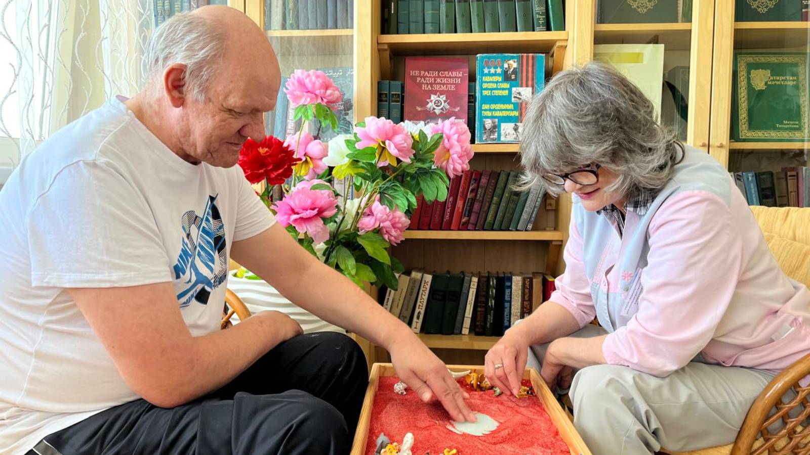 Югары Ослан өлкәннәр һәм инвалидлар интернат-йортында ком терапиясе белән шөгыльләнүнең нәтиҗәсе зур. Шушы көннәрдә социаль тернәкләндерү буенча белгеч Татьяна Стригачева социаль хезмәтләр алучы 56 яшьлек Сергей Новиков белән дәрес үткәрде. Бу тәрбияләнүче интернат-йортка инсульттан соң кергән, аның тәненең уң ягы параличланган, сөйләме бозылган. Башка яшәүчеләр кебек үк, аңа да ком белән шөгыльләнү бик ошый.